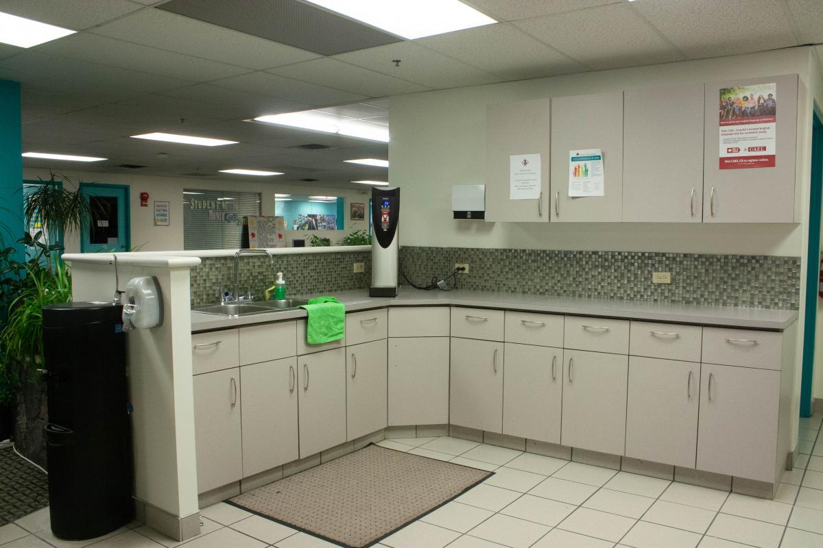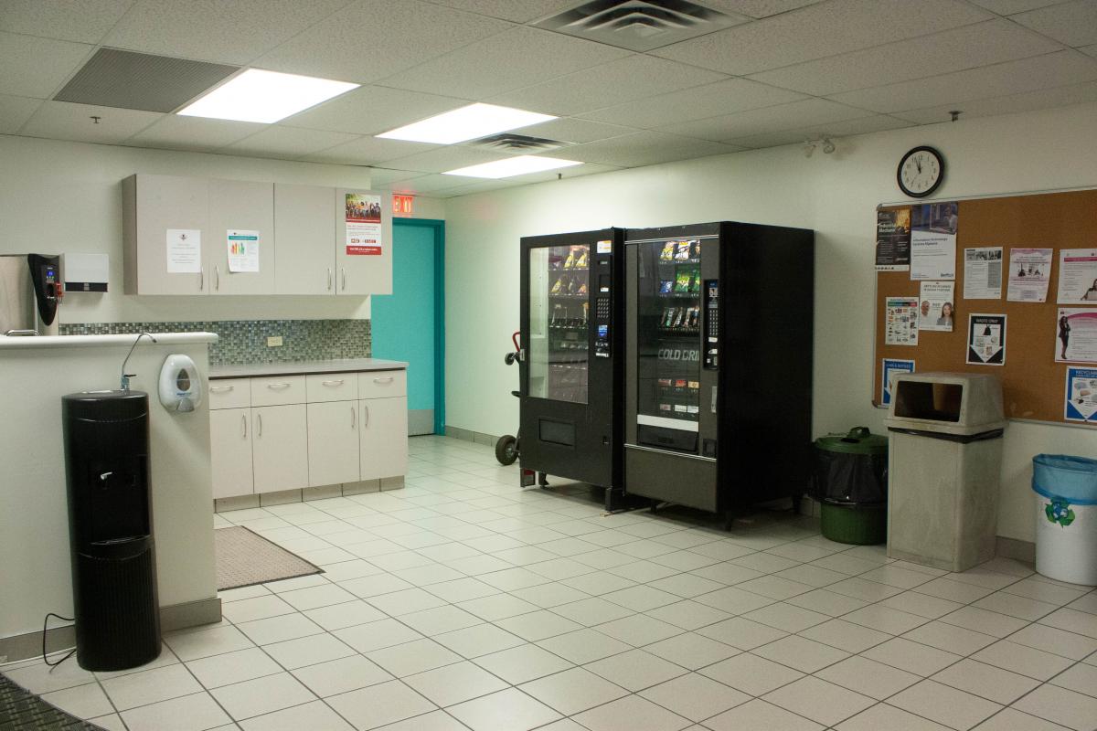 This space allows students access to a kitchen area, equipped with a hot water dispenser, sink, water cooler, and vending machines to fit their eating needs.